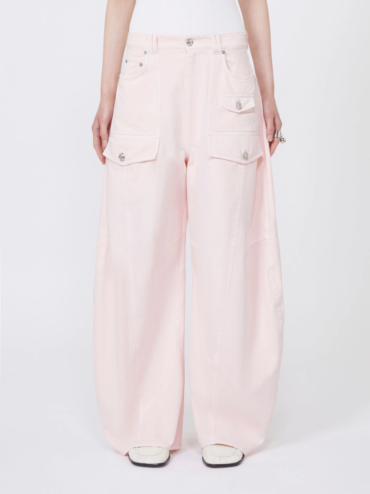 Low-rise, dropped-crotch trousers featuring large utility-style pockets and a curved leg cut. The branded metal buttons add a casual touch. Tone-on-tone stitching motif that highlights the constructive seams and darts.